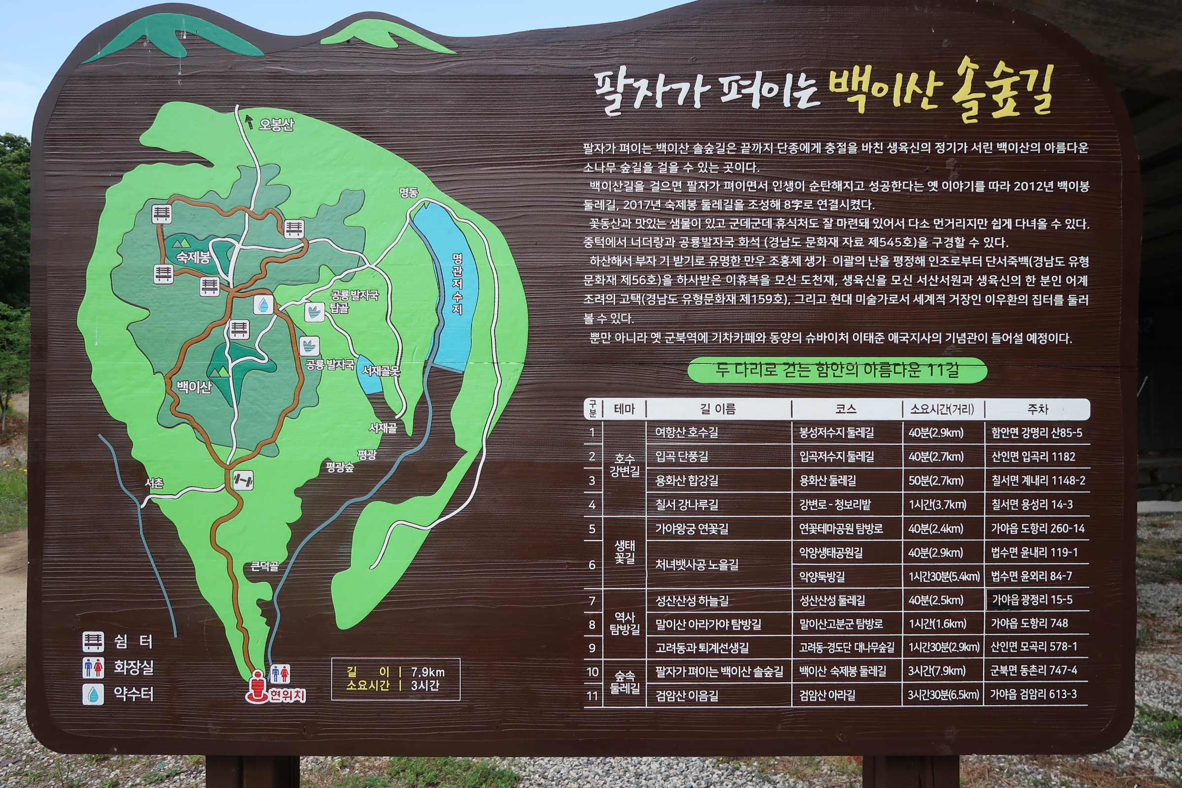 또한, 팔자가 펴이는 백이산 솔숲길은 7.9km로 두다리로 걷는 함안의 아름다운 11길에 포함되어 있다.